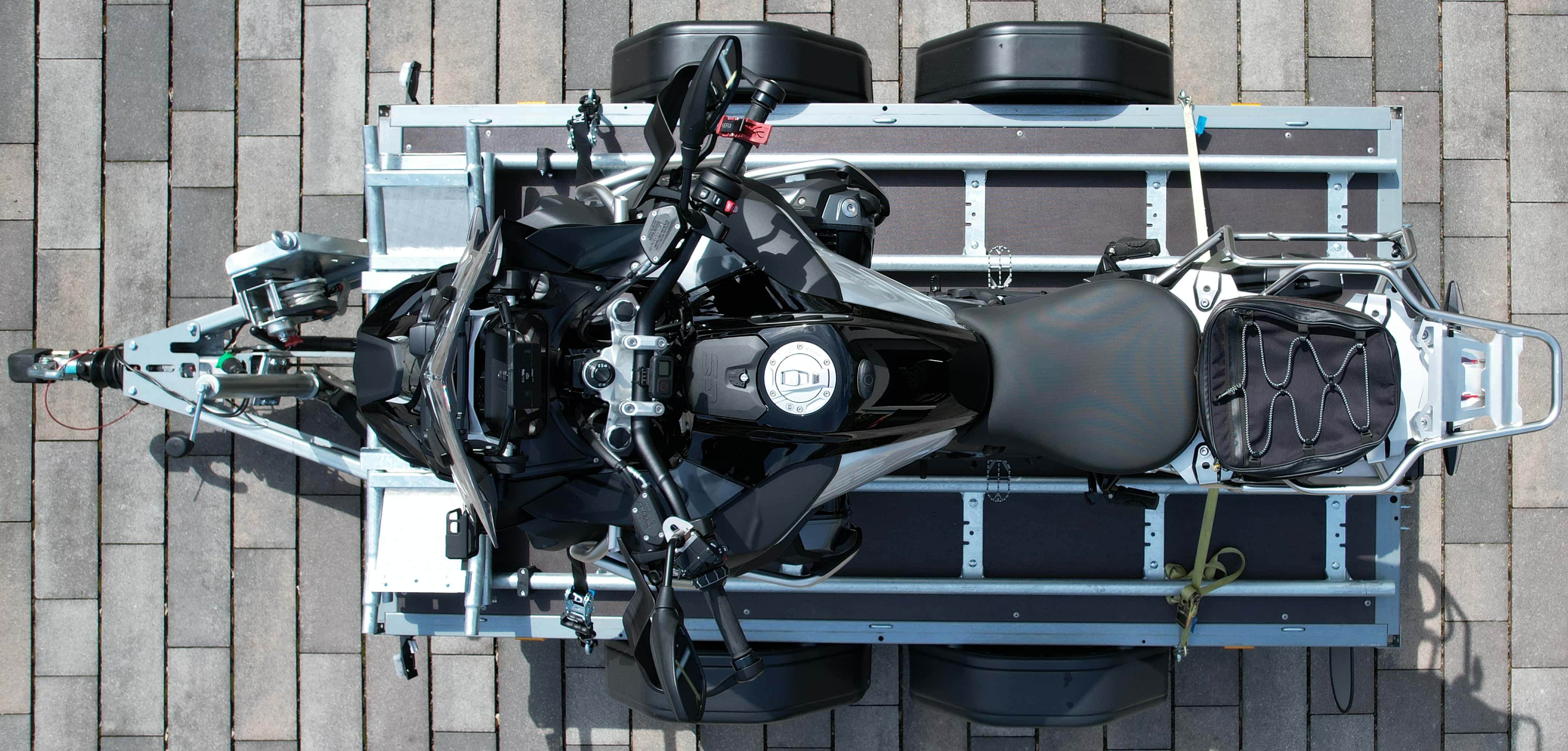Meinen alten van Vossen Anhänger habe ich einfach für die Motorradbeladung über die Luftfederung auf den Boden abgesenkt, die Maschine bequem und sicher draufgeschoben, verzurrt und mit Luftdruck dann den Anhänger wieder angehoben.