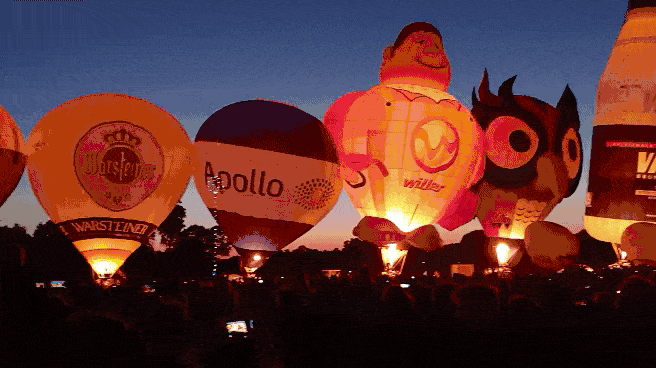 Ab ca. 22.30 Uhr beginnen dann die Ballons, im Rhythmus der Musik ihre Brenner und damit auch die Ballonhülle hell erleuchten zu lassen.