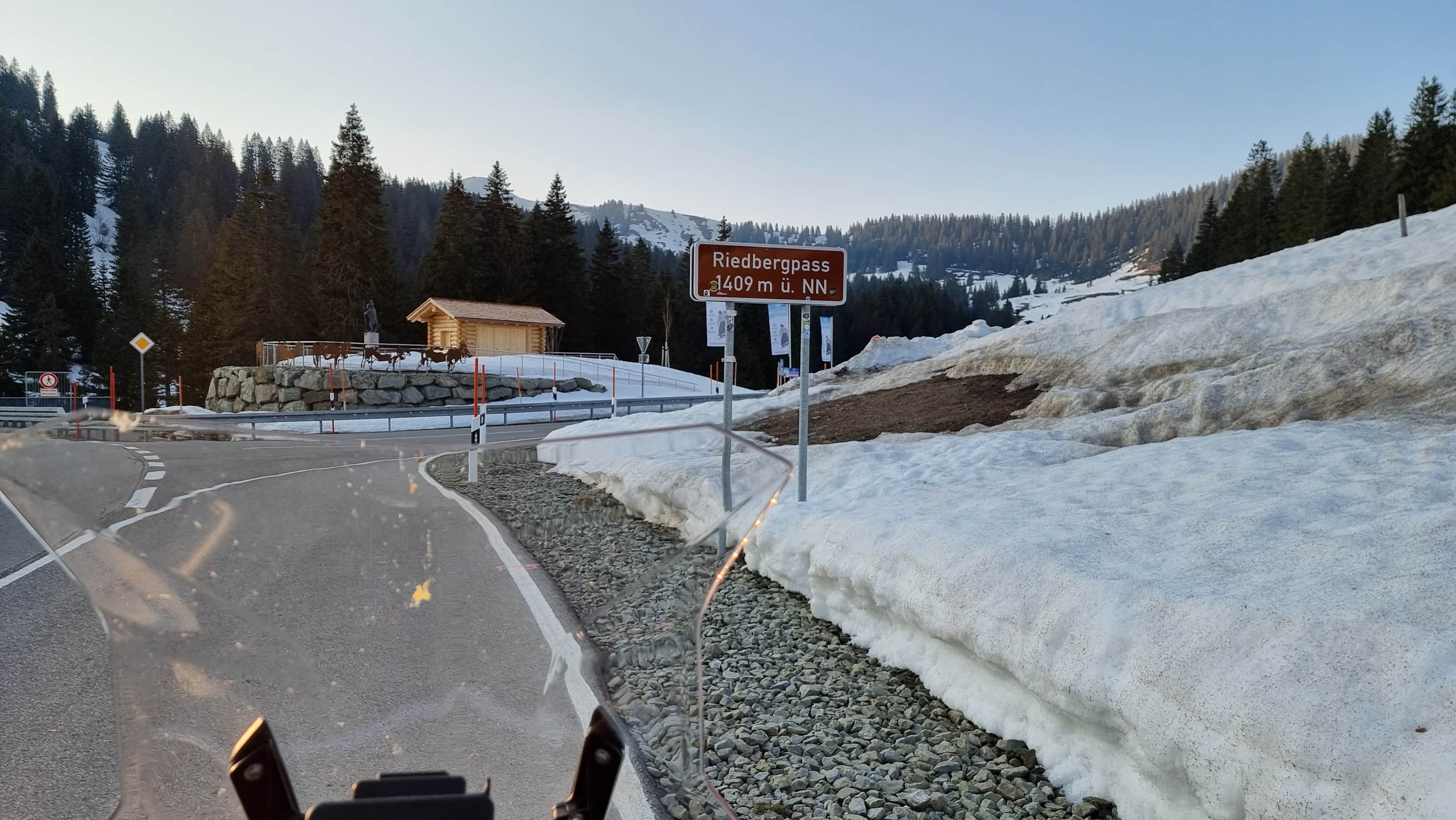 Das Erreichen des Riedberpasses markiert die höchste Stelle der heutigen Tour und auch der Touren der nächsten Tage. Obwohl es bis zu 19 Grad warm ist, liegt immer noch Schnee an exponierten Stellen oder auf dem Pass.