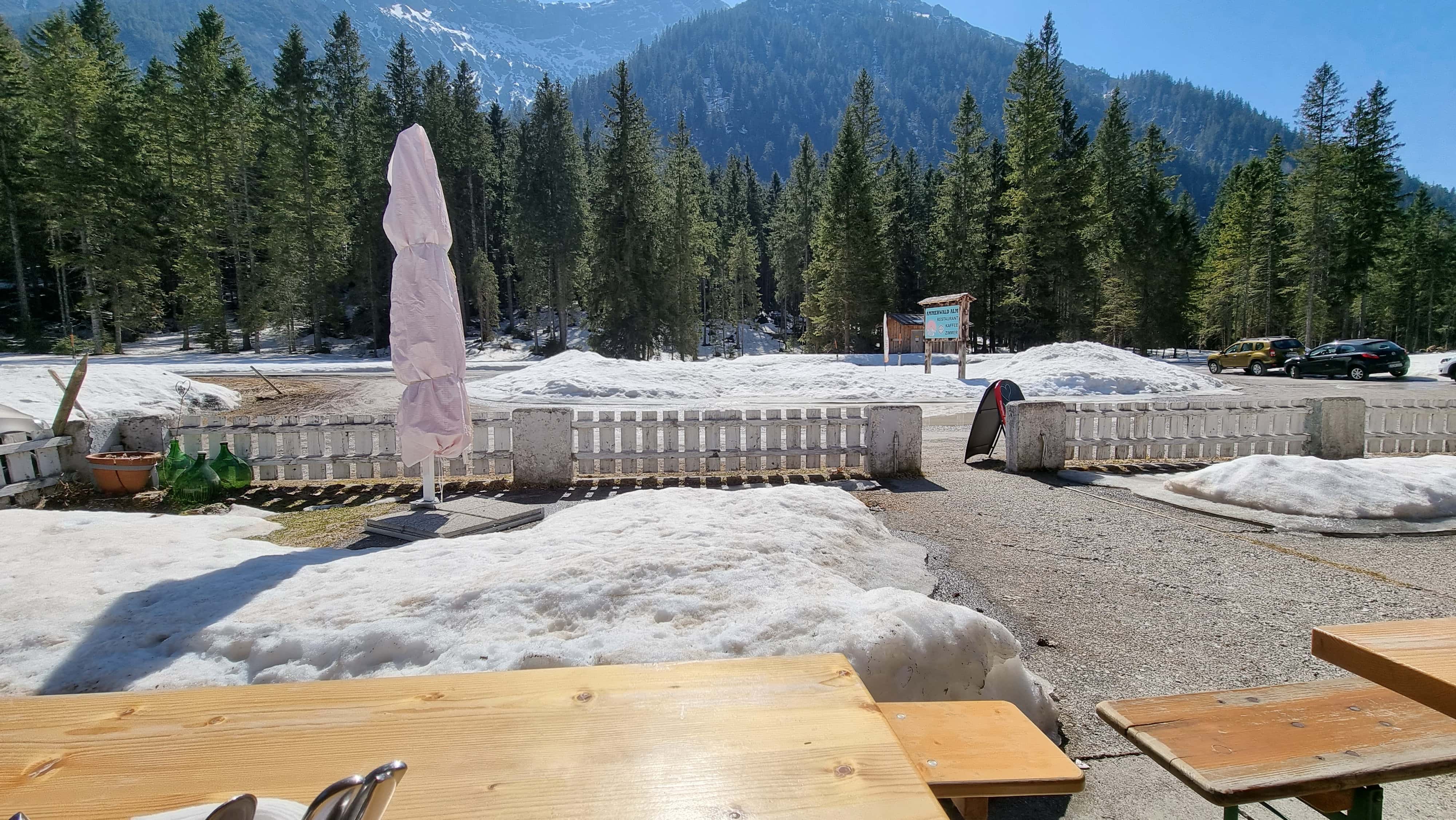 Hier liegt teilweise noch richtig viel Schnee, und so genieße ich die warme Sonne an der Ammerwald Alm.