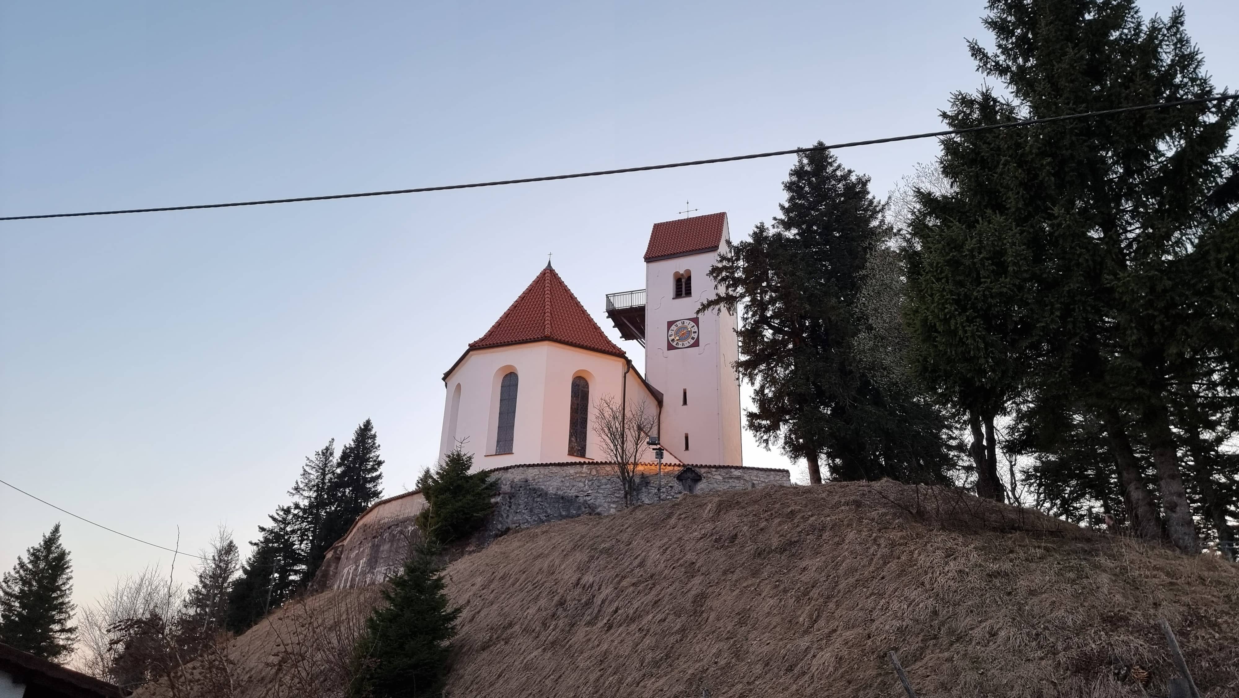 Neben einem Gasthaus ist auf dem Auerberg auch eine Kirche, die am Turm eine Aussichtsplattform hat.