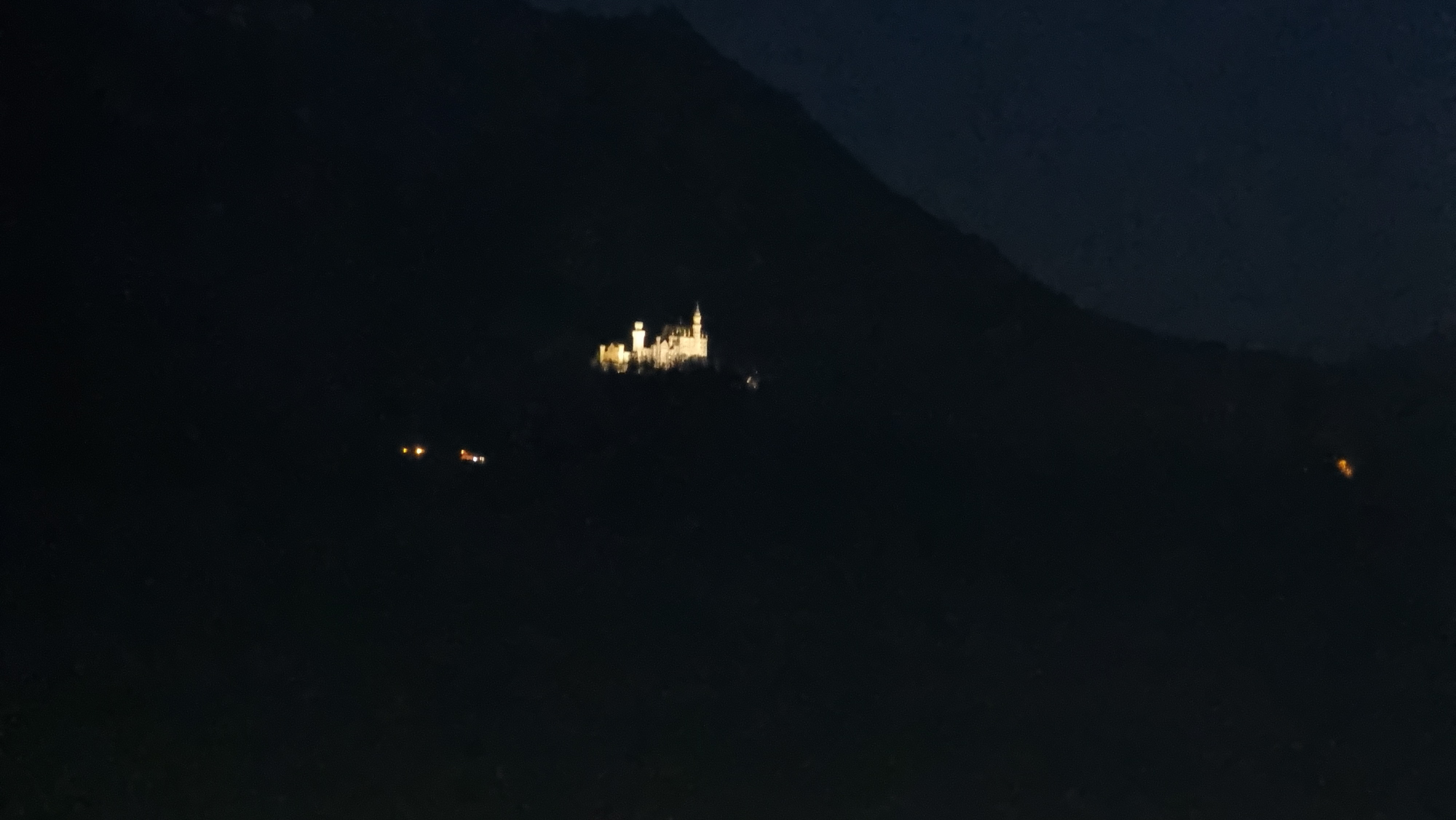 Mittlerweile ist es schon recht spät geworden und so fahre ich östlich am Froggensee zurück nach Füssen. In der Dunkelheit sehe ich noch das beleuchtet Schloss Neuschwanstein.