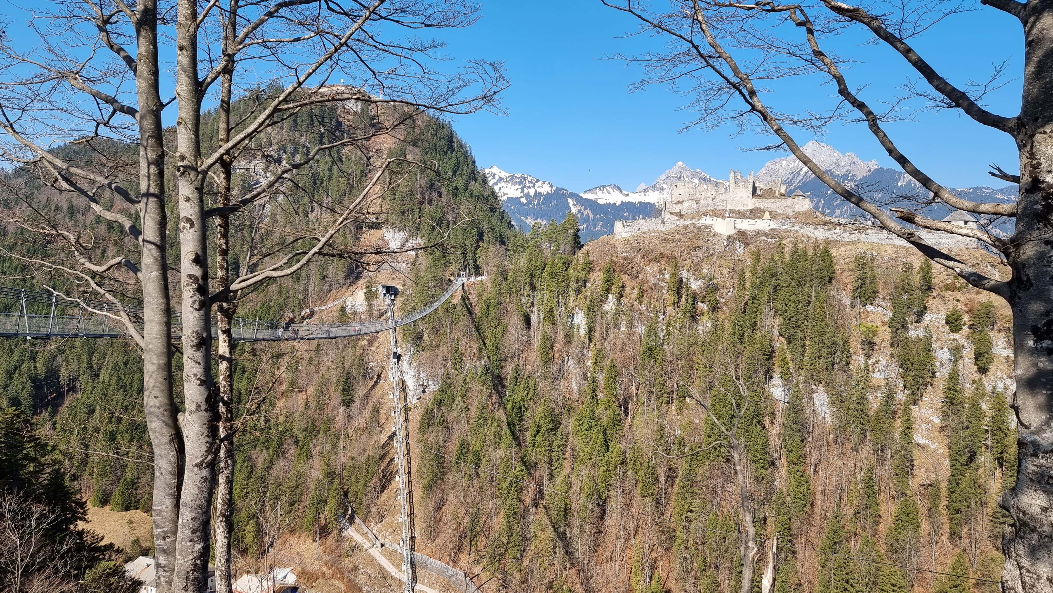Hängebrücke Highline179 mit Blick auf die Burg Ehrenberg