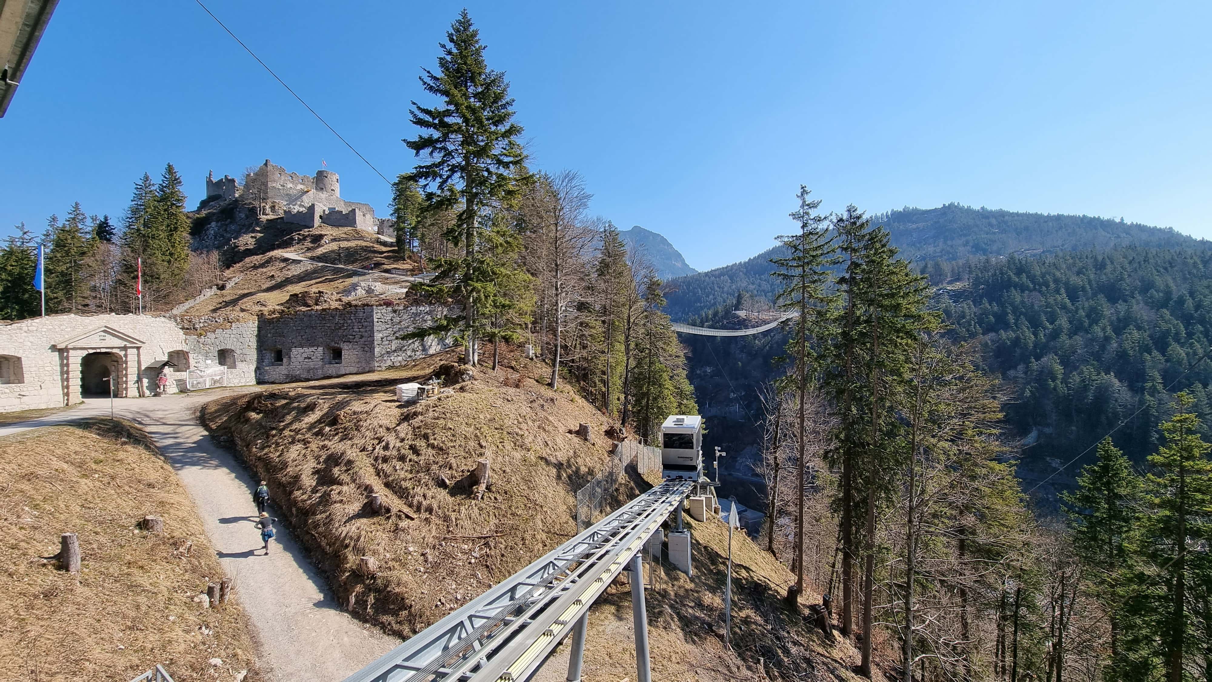 Die Hängebrücke sieht schon von unten beeindruckend aus, aber das hält mich nicht davon ab, mir das Kombiticket zu kaufen und mit dem Ehrenberg Liner nach oben zu fahren.