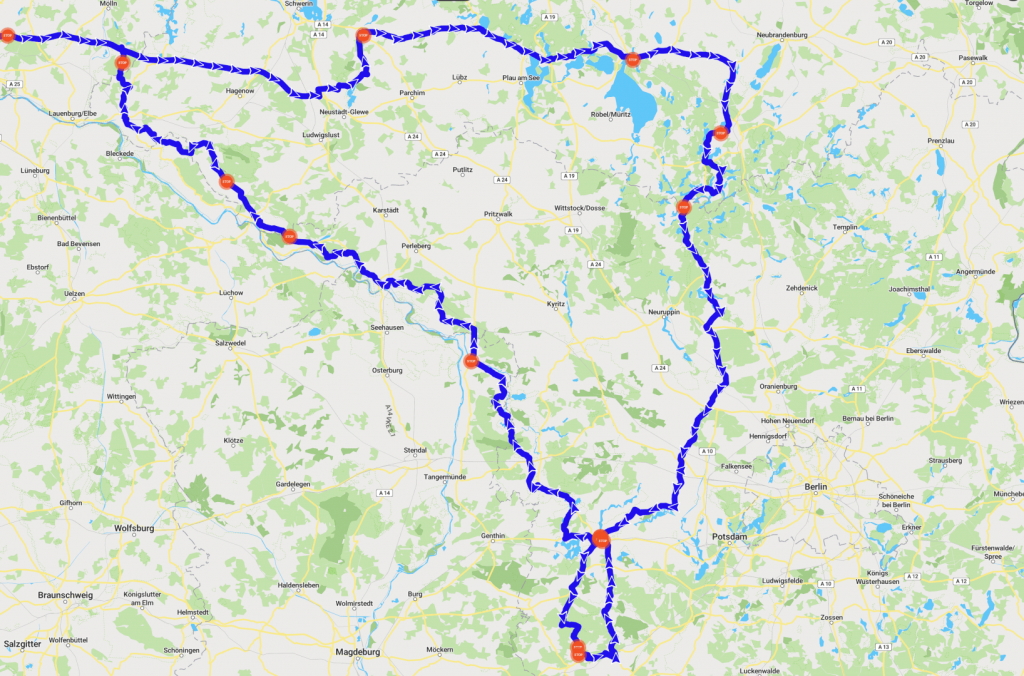 Ich starte in Hamburg noch bei ungemütlich nebeligem Wetter, aber quasi direkt hinter der Stadt bricht die Wolkendecke auf und ich fahre das erste Stück meiner Strecke auf der Autobahn im Sonnenschein. Meine Route geht zuerst an die Mecklenburgische Seenplatte mit einem ersten Kaffeestopp in Waren an der Müritz. Hier hatte ich schon auf einer Tour 2019 übernachtet und es gefällt mir auch diesmal wieder sehr gut.