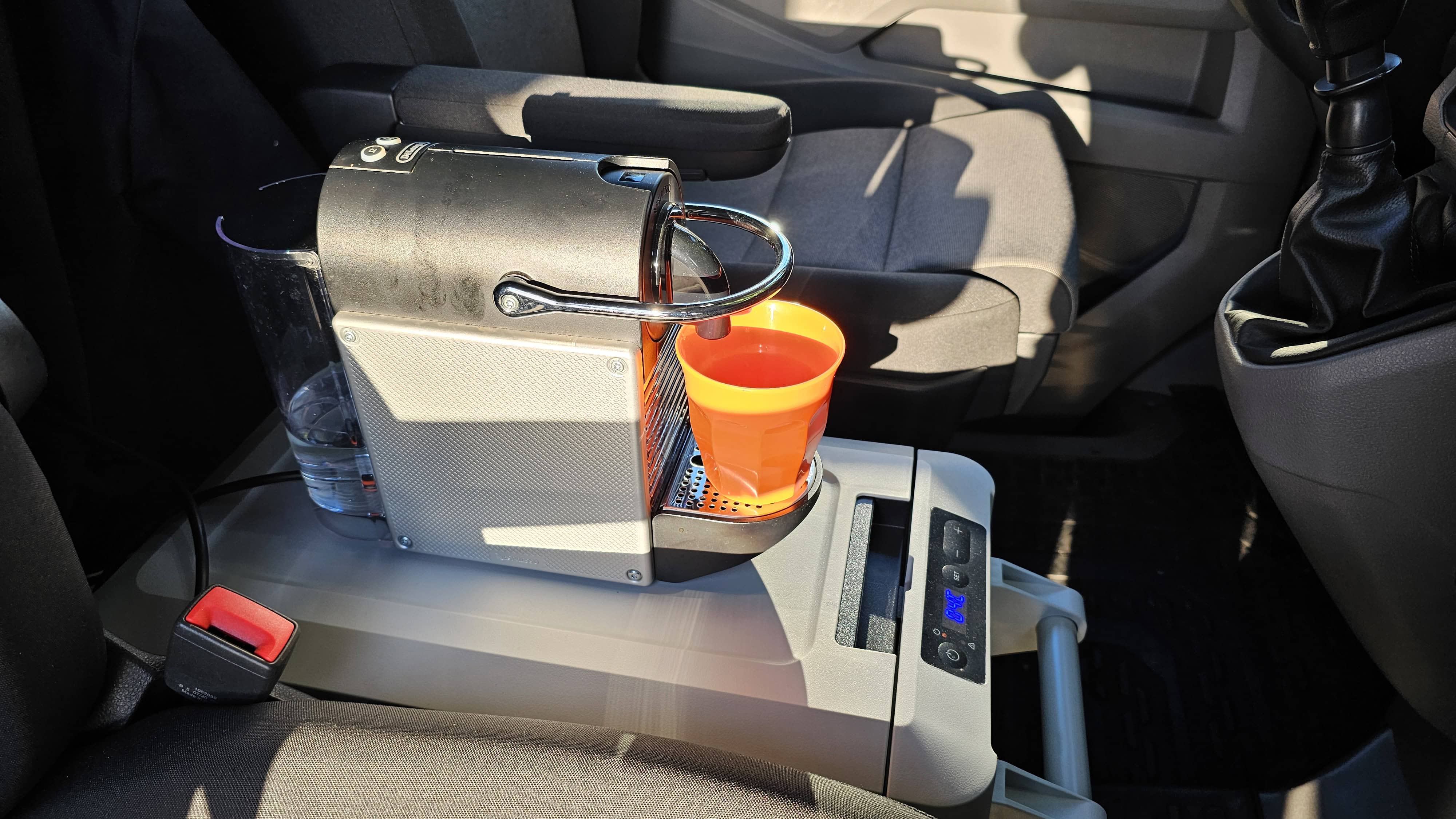 Hier esse ich Waffeln und trinke einen Kaffee aus der kleinen Espressomaschine, die ab jetzt zur Grundausstattung des Crafters gehört.