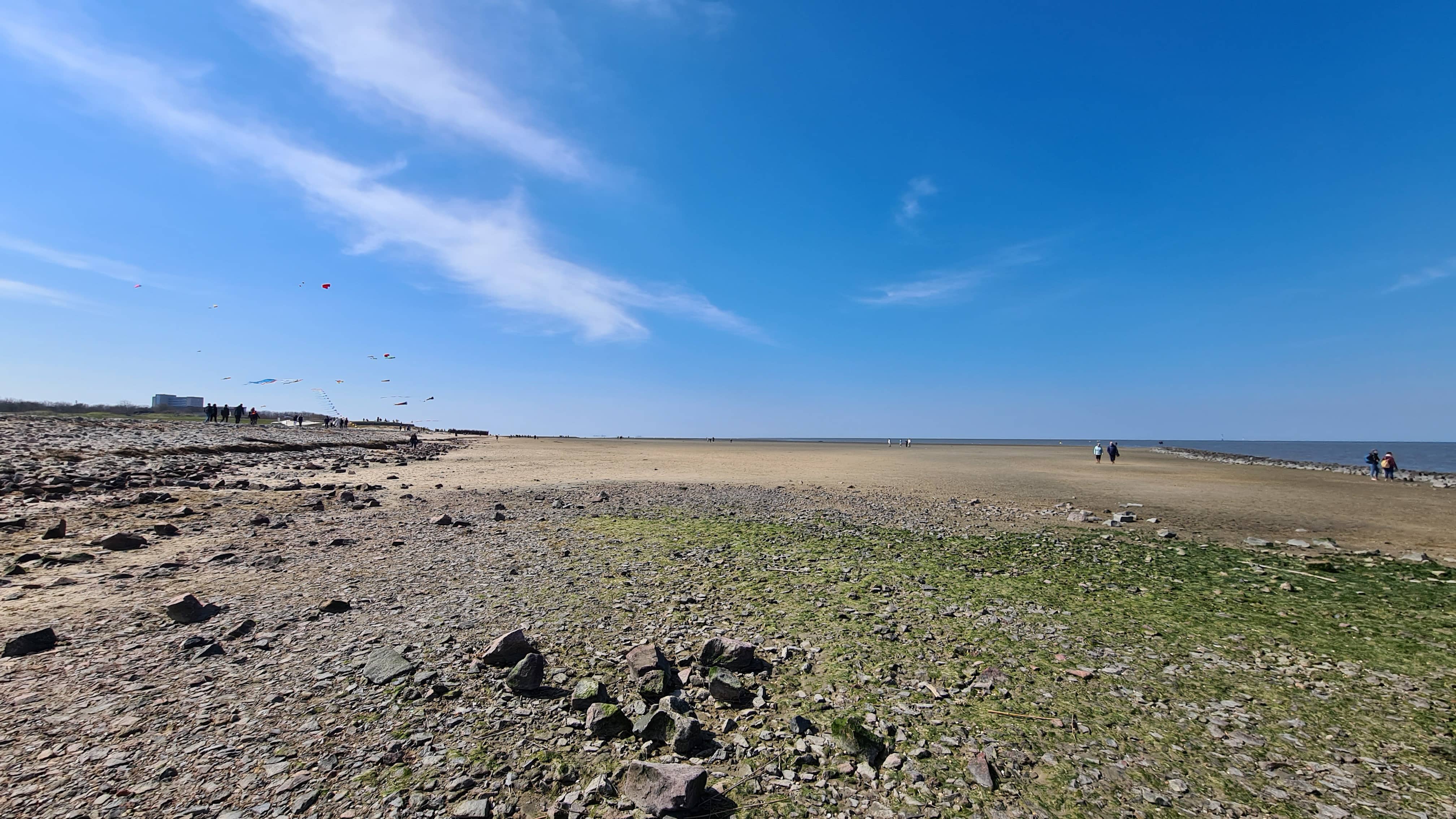 Irgendwann riecht es dann plötzlich nach Meer und mein Tagesziel kommt immer näher. Schließlich komme ich in Cuxhaven an, parke meine GS und laufe zum Strand. Der Wind weht mir um die Ohren, aber es ist sehr warm in der Sonne. Die Kugelbake, ehemals wichtiger Orientierungspunkt für die Schifffahrt, ist heute von vielen bunten Drachen umgeben. Ich schau mir die Bake kurz aus der Nähe an und laufe noch ein kleines Stück übers Watt.