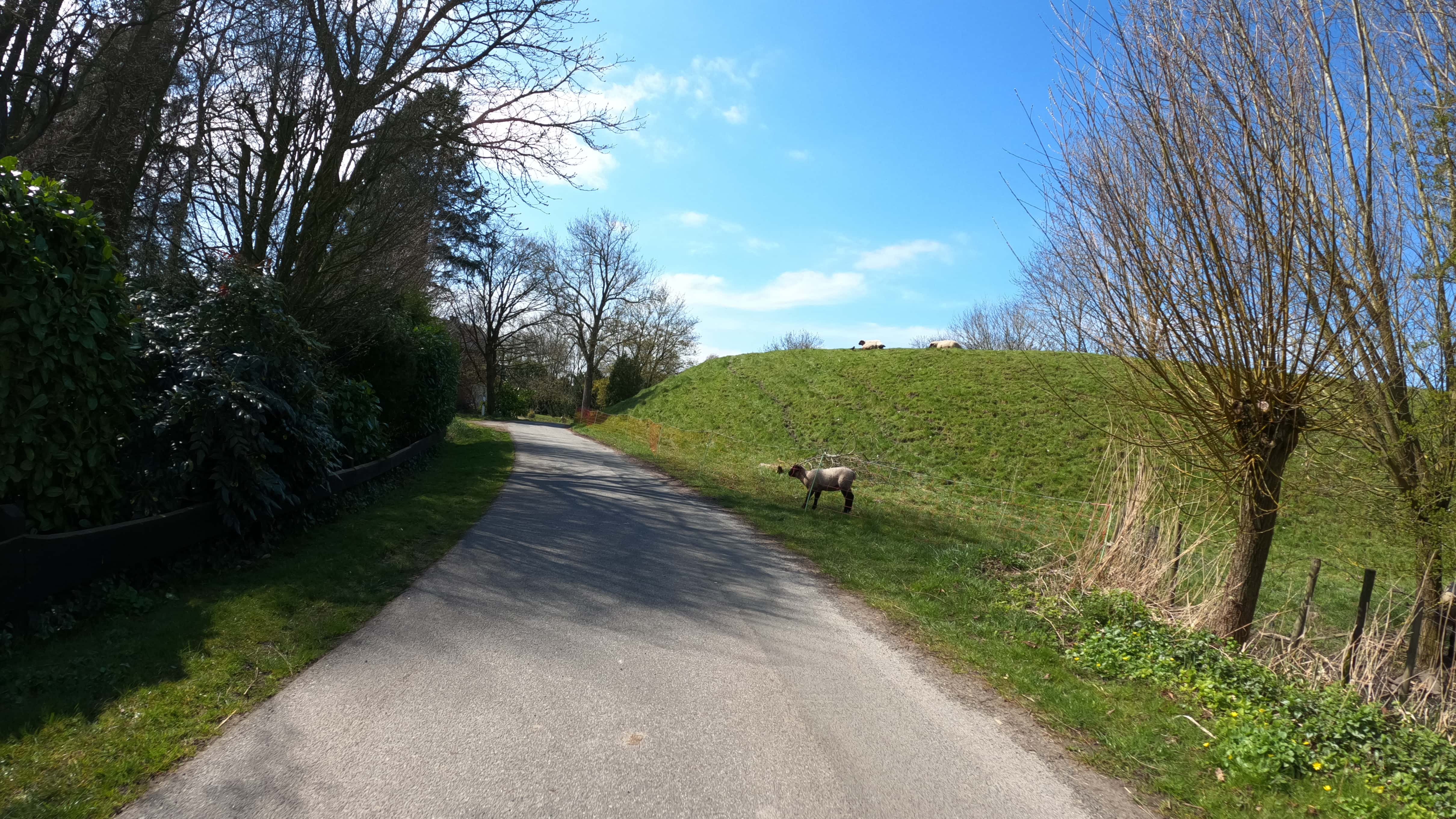 In Freiburg (hier leider ohne Berge) biege ich von der Hauptstraße in eine kleine Straße ab und fahre dann direkt am Deich entlang. Darauf stehen die Schafe, auch einige kleine, wie im Bilderbuch und grasen. Links von mir ziehen immer wieder Höfe und Häuser vorbei. Ich fahre gemütlich und leise, um die Anwohner nicht zu stören und um die schöne Kulisse zu genießen.