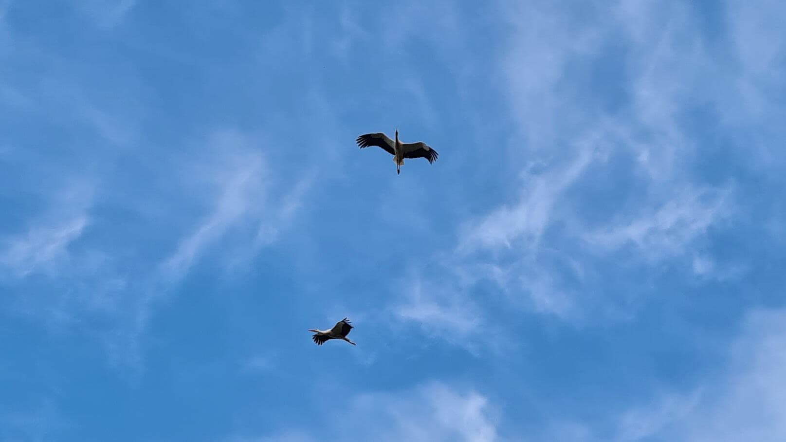 In Wassermühle lege ich dann noch eine letzte Trinkpause an einer ruhigen Straße ein und sehe plötzlich einen Storch, der sich nicht weit von mir auf einen Baum setzt. Als er wieder abhebt, sehe ich, dass noch zwei weitere Störche über mir kreisen. Ich kann alle Drei eine Weile lang sehr gut beobachten.