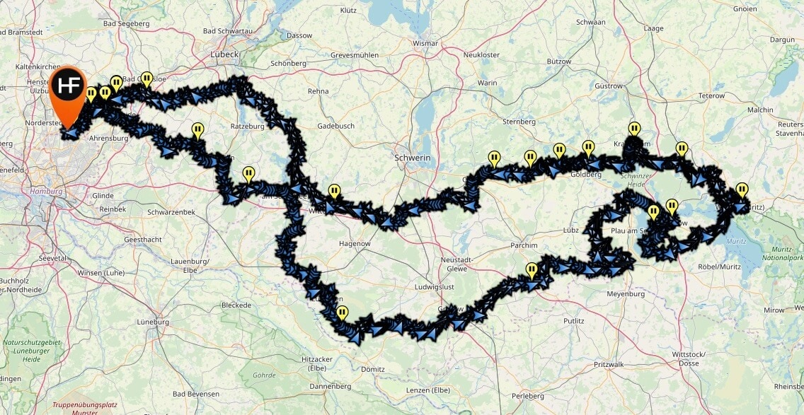 Koffer gepackt, losgefahren! Schön wieder auf dem Bock zu sitzen. Jetzt geht es Richtung Westen wieder raus aus der Mecklenburgischen Seenplatte. So kurvig wie möglich, führt mich das Navi wieder durch die bewundernswerten Alleen und Wälder, vorbei an ein paar hinter den Bäumen aufblitzenden Seen.