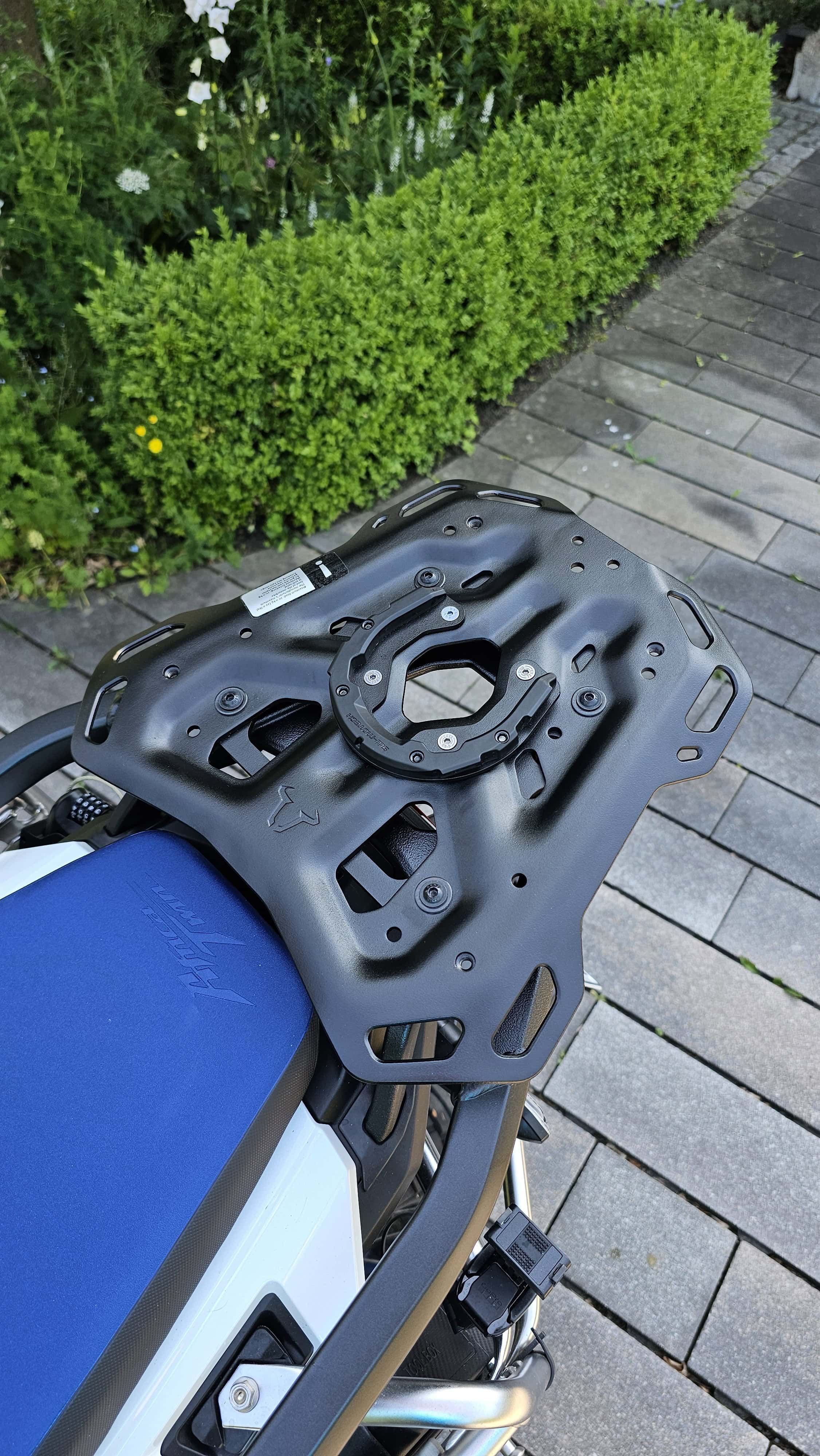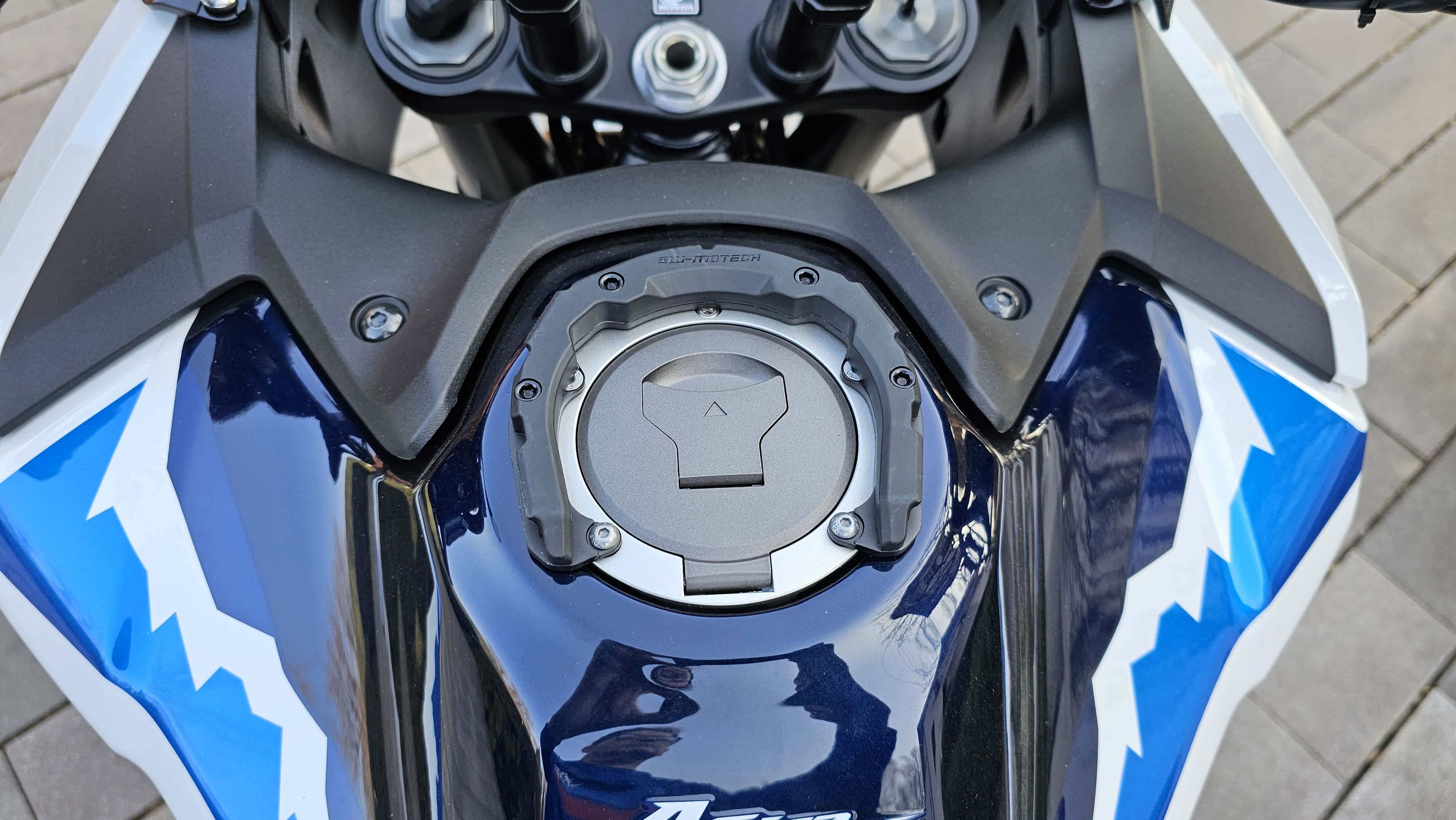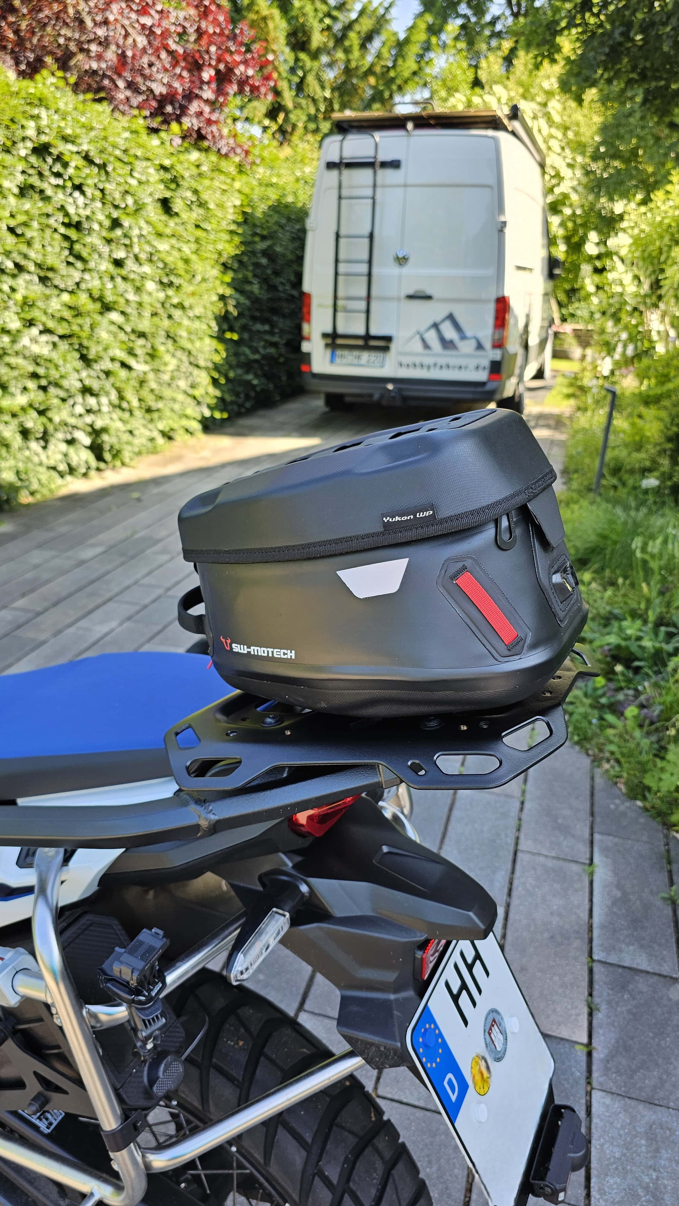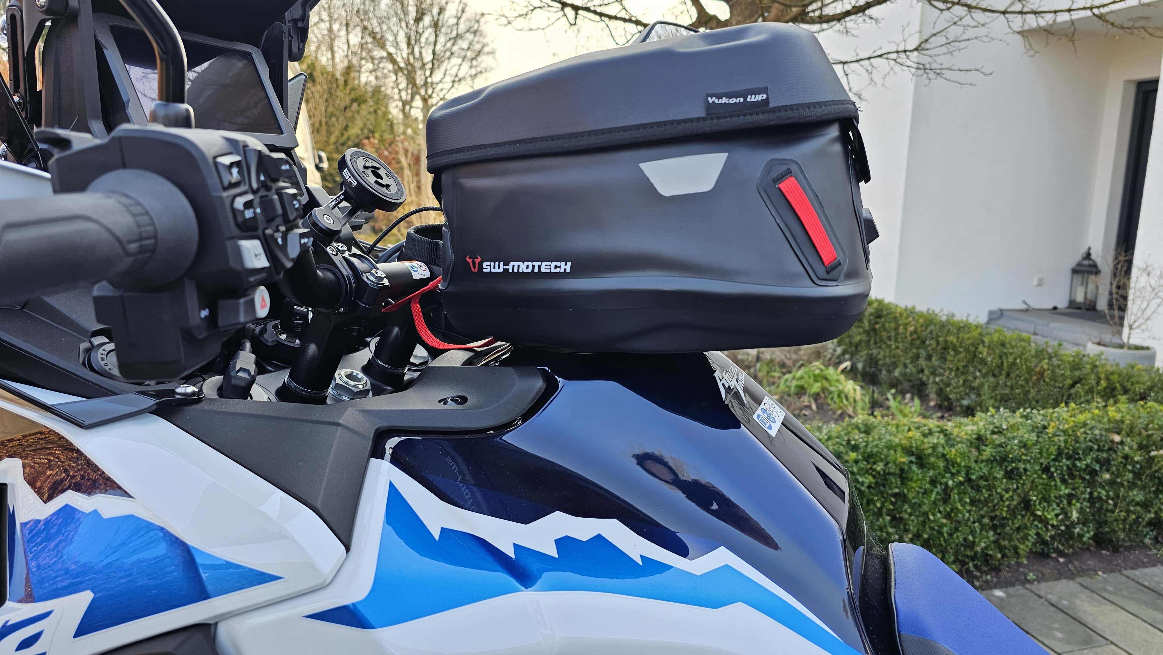 Ich habe mich für die magnetische PRO Schnellwechsellösung von SW-Motech und dem wasserdichten Tankrucksack Yukon WP entschieden. Hinten ist der Adventure-Rack Gepäckträger mit einem weiteren PRO Tankring installiert.