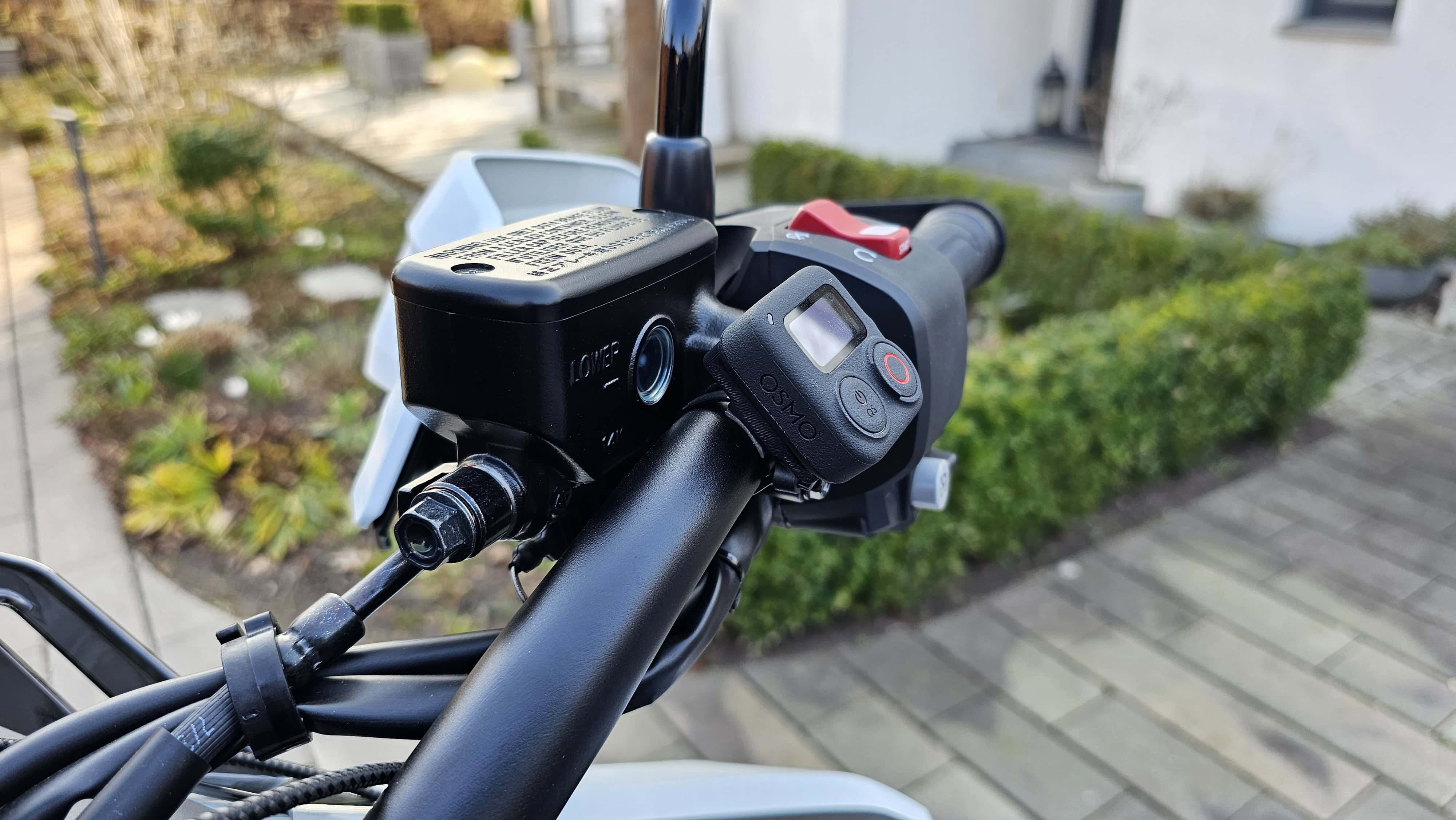 Halterung von Thronbikeparts. Die Verlängerung ist notwendig, damit die Lenkung nicht eingeschränkt wird. Die Kamera vibriert trotz der Verlängerung nicht. Mehr zum Thema Halterung findet ihr hier.