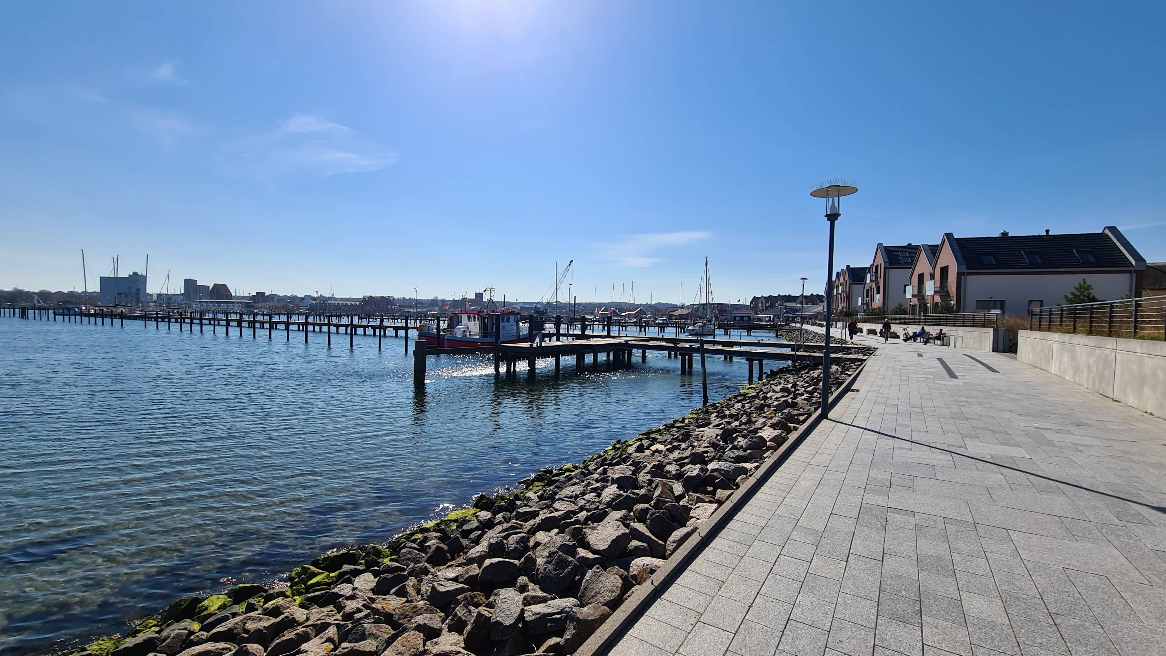 Nun geht es aber zu meinem eigentlichen Zwischenstopp: Heiligenhafen. Ich parke und laufe einmal über den Hauptweg, um das Hafenpanorama in der Sonne anzusehen.