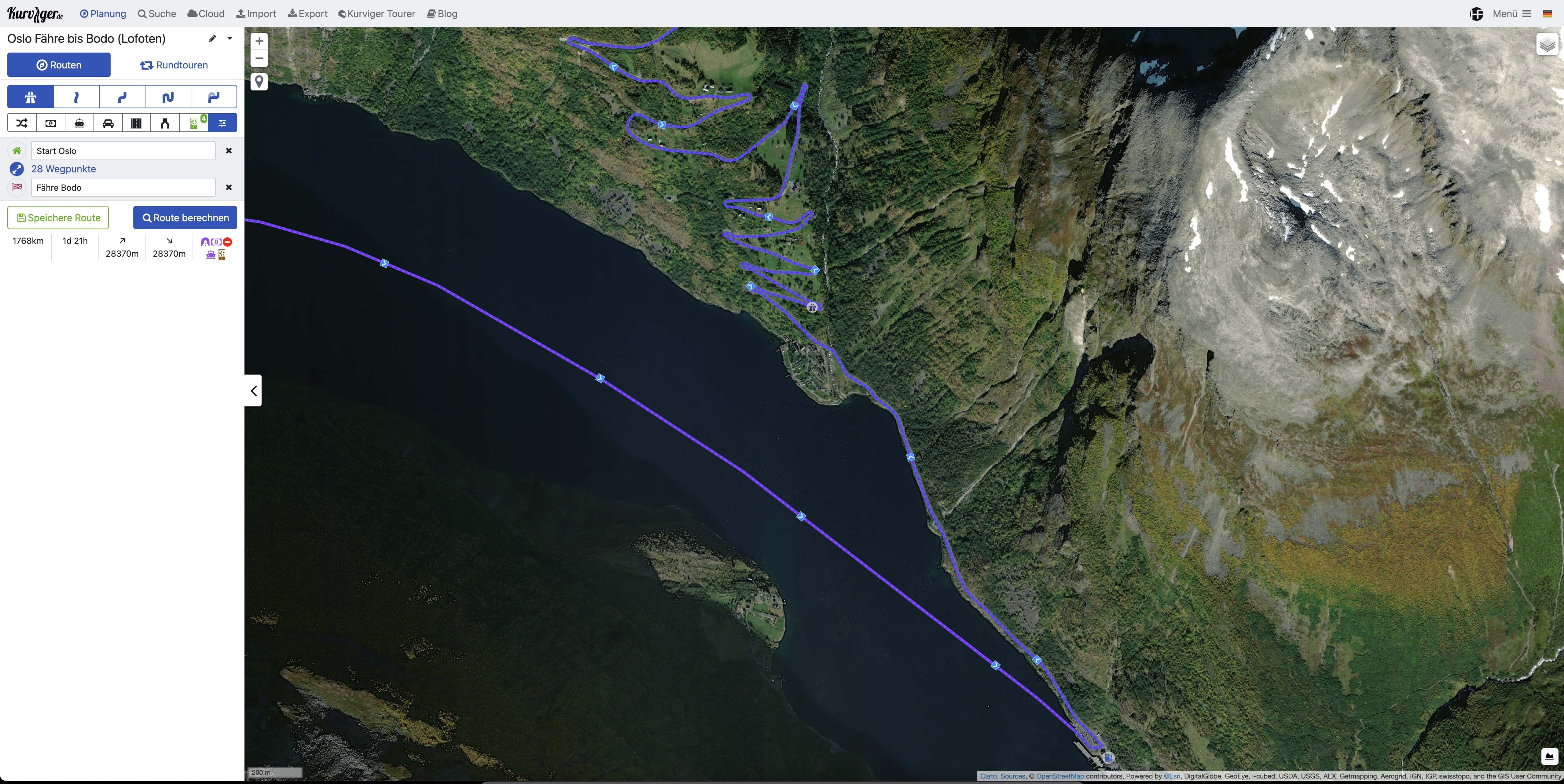 Alle Zwischenziele können mit eigenen, beliebig langen Textinformationen beschrieben werden, was für mich eine der absolut wichtigsten Funktionen in Kurviger.de darstellt. So kann man wichtige Informationen zu dem jeweiligen Zwischenziel (die blauen Nummern im Bild), wie z.B. Fährzeiten, Kosten oder allgemeine Angaben, hinterlegen. Die Texte der Zwischenziele werden dann in der App bei Erreichen, z.B. über das Headset, vorgelesen. Diese „Tourguide-Funktion“ ist sehr praktisch und erleichtert einem die Reise oder versorgt Mitfahrer auf der Tour mit zusätzlichen Infos.