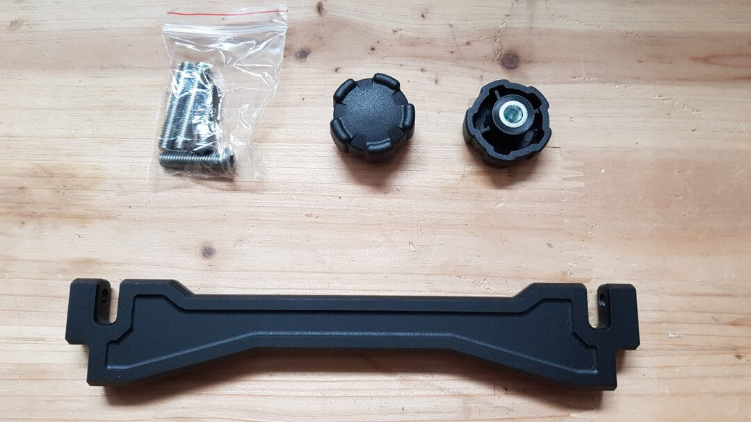 Das Bauteil sitzt sehr stramm in der BMW-Halterung. Die Gewindestangen durch den BMW-Halter durchstecken und im Scheibenversteller verschrauben (Inbus) und danach die Kunstoff-Rändelschrauben aufschrauben.