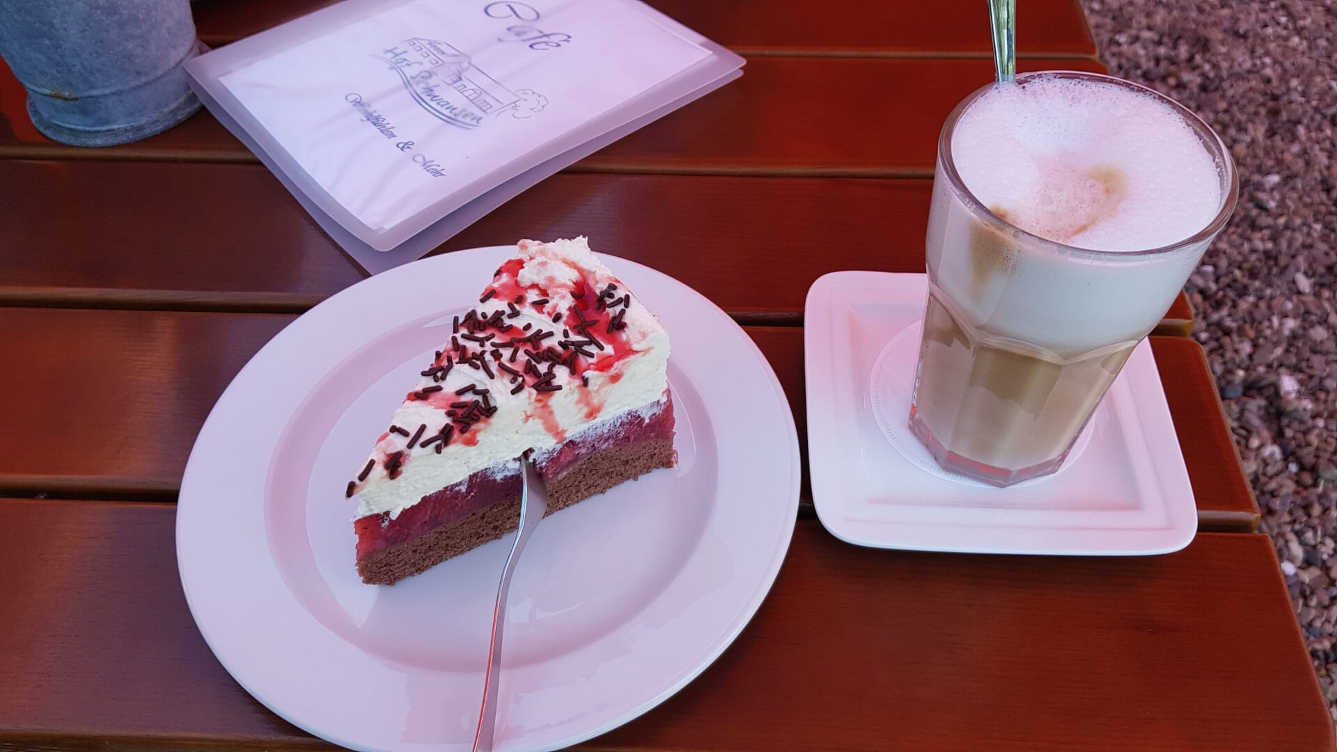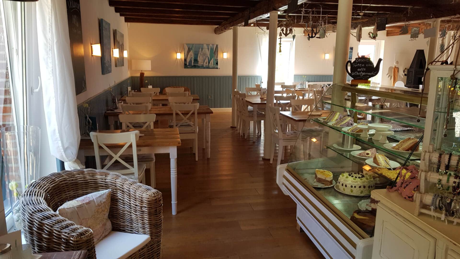 Die B203 führt mich nach Karlberg und dann bin ich auch schon ziemlich bald an meinem, mit inzwischen starken Kuchen-Hunger ersehnten, Zwischenziel angekommen: Das Café Schwansen in Schönhagen. Ein nettes Lokal in absolut idyllischer Umgebung begrüßt mich. Ich bin früh dran und daher ist es noch nicht voll. In schönstem Sonnenschein setzte ich mich an einen Tisch nach draußen, wo z.B. ein Strandkorb steht und daran erinnert, dass man direkt am Meer ist. Ich bekomme Latte und selbstgemachte Erdbeer-Torte vom freundlichen Personal serviert.