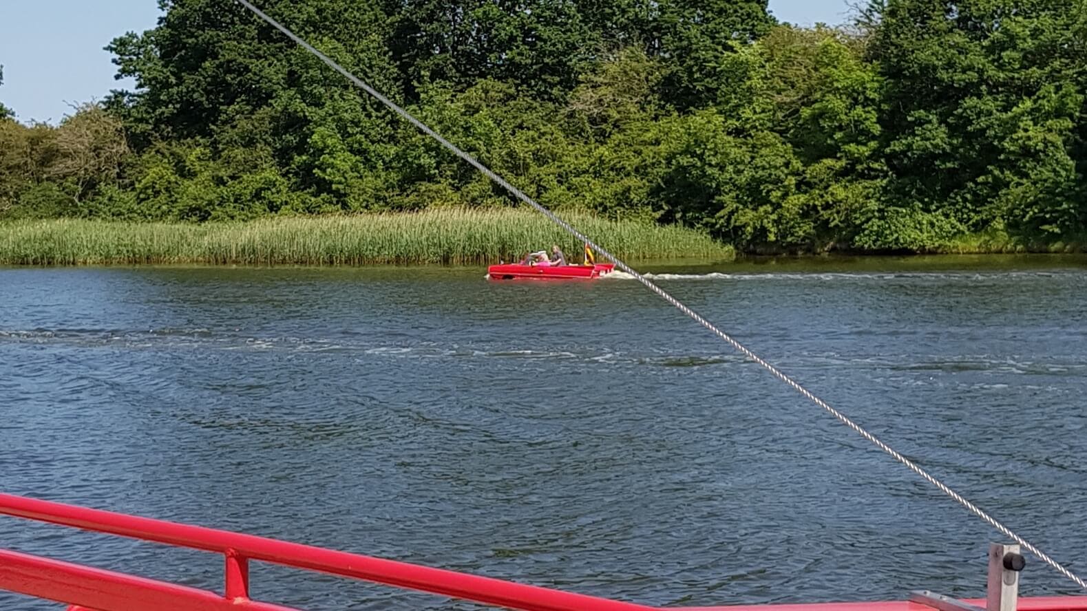 Auf der anderen Seite fährt gerade ein Amphibienfahrzeug ins Wasser und zieht alle Blicke auf sich.